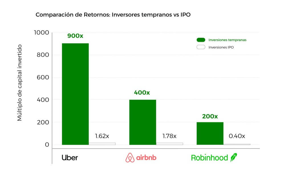 Los números no mienten: Los primeros inversores de Uber multiplicaron su capital 900 veces. En Airbnb, los inversores iniciales apostaron cuando la valoración era apenas de 2,5 millones de dólares, comparado con los 47 mil millones en su IPO. La historia de Robinhood resulta aún más reveladora: sus primeros financiadores acumularon fortunas importantes, mientras que los inversores de la IPO han visto pérdidas superiores al 60%.